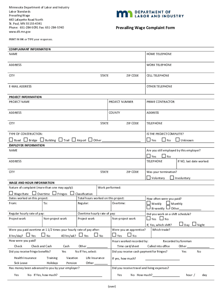 The prevailing wage complaint form typically requires detailed information about the alleged violation, including the name of the employer, the project location, the type of work performed, and any evidence supporting the complaint.