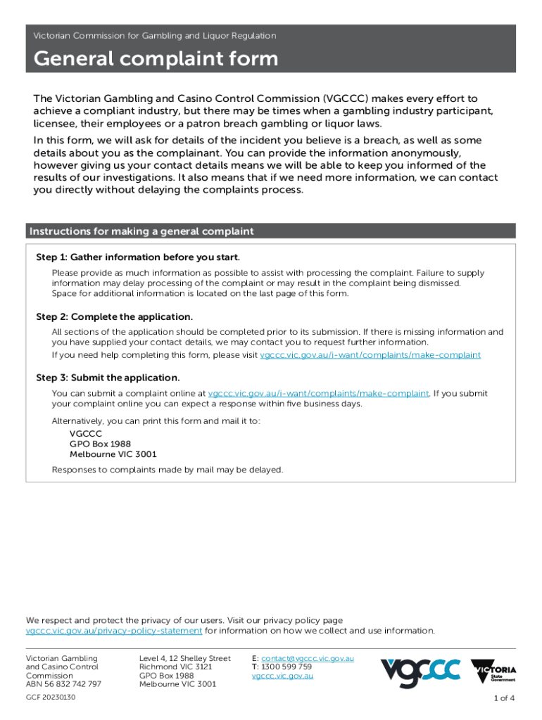 Victorian Commission for Gambling and Liquor RegulationGeneral complaint form The Victorian Gambling and Casino Control Commission (VG CCC) makes every effort to achieve a compliant industry, but