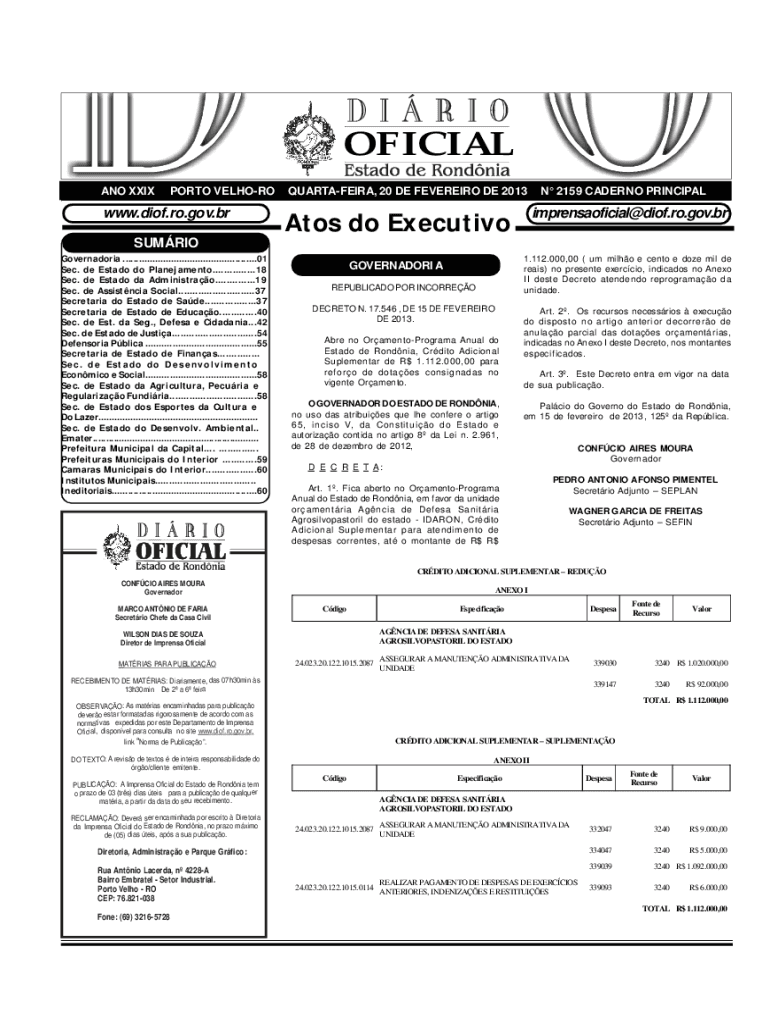 ANO XXIXPORTO VELHOROwww. Dion.RO.gov.brQUARTAFEIRA, 20 DE FEDERICO DE 2013 N 2159 SALERNO Principality do Executivoimprensaoficial@diof.ro.gov.brGOVERNADORIA1.112.000,00 (um Milo e cent