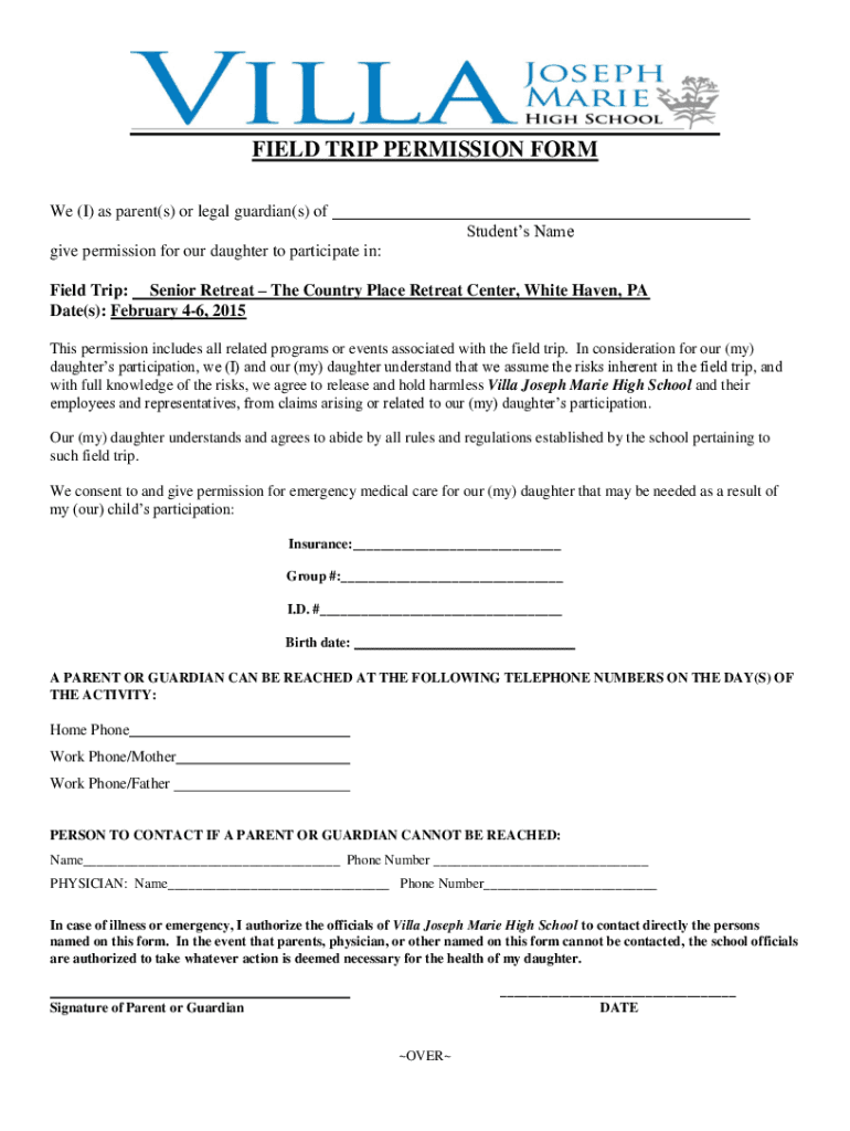 FIELD TRIP PERMISSION FORM We (I) as parent(s) or legal guardian(s) of Students Name give permission for our daughter to participate in: Field Trip: Senior Retreat The Country Place Retreat Center,