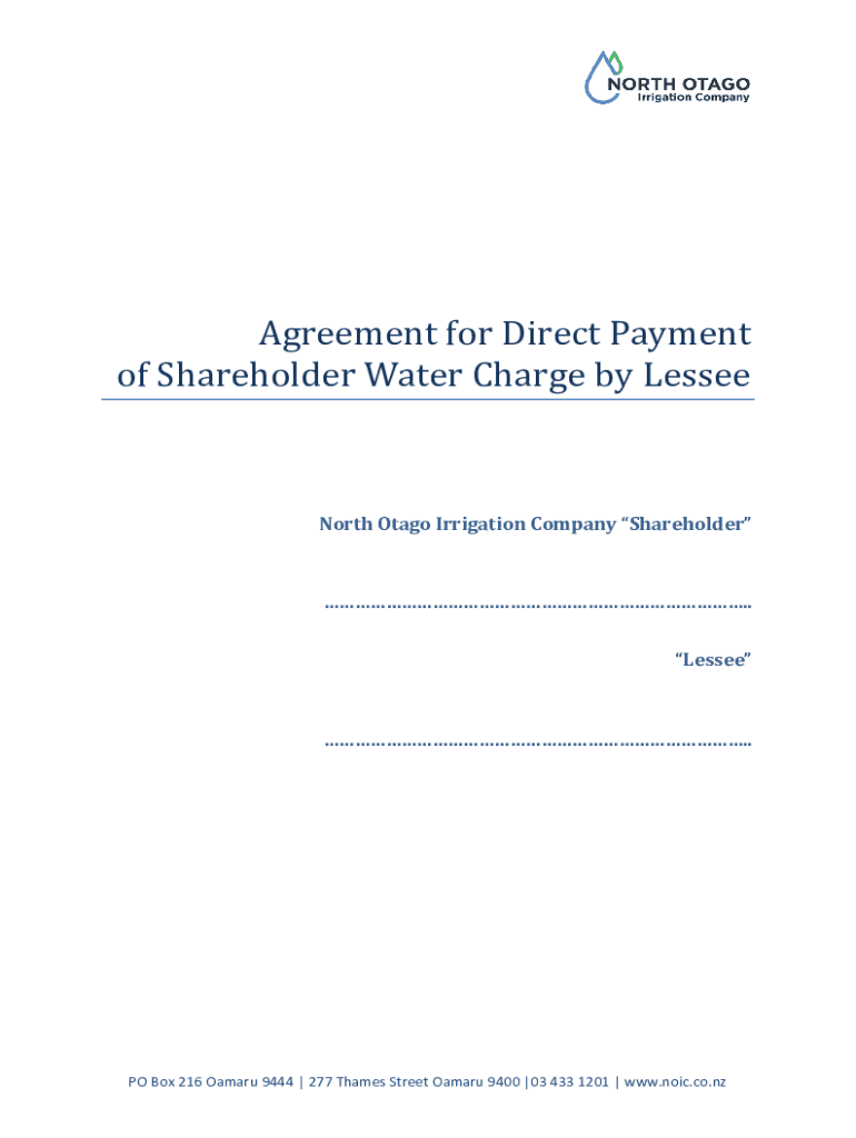 Agreement for Direct Payment of Shareholder Water Charge by Lessee North Stage Irrigation Company Shareholder. Lessee.PO Box 216 Amaru 9444 | 277 Thames Street Amaru 9400 |03 433 1201 | www.noic.co.nzAGREEMENT