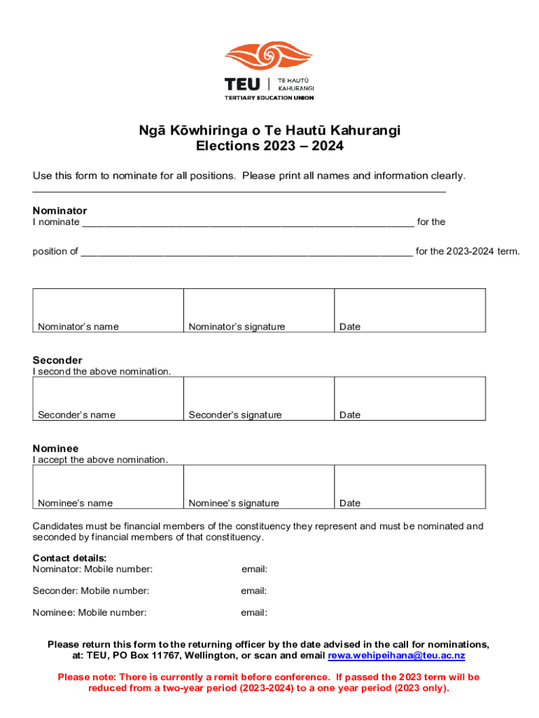 NG Hiring o Te Hat Maharani Elections 2023 2024 Use this form to nominate for all positions. Please print all names and information clearly. ___ Nominators nominate ___ for the position of ___ for