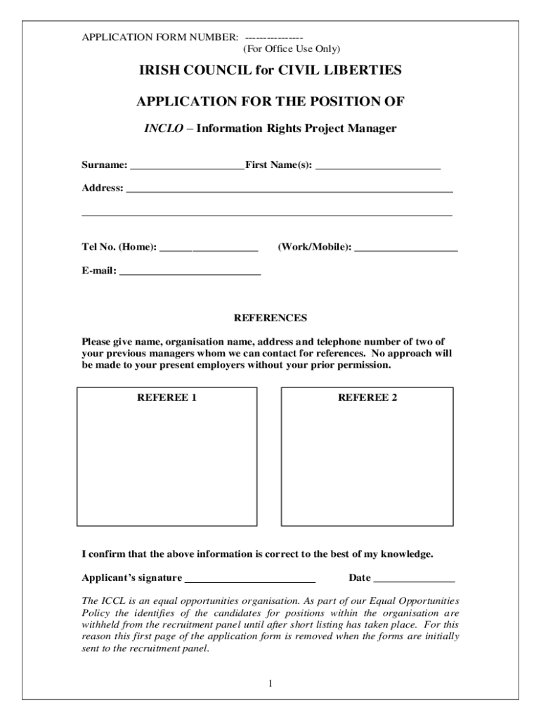 APPLICATION FORM NUMBER: (For Office Use Only)IRISH COUNCIL for CIVIL LIBERTIES APPLICATION FOR THE POSITION OF INCL Information Rights Project Manager Surname: ___ First Name(s): ___ Address: ___