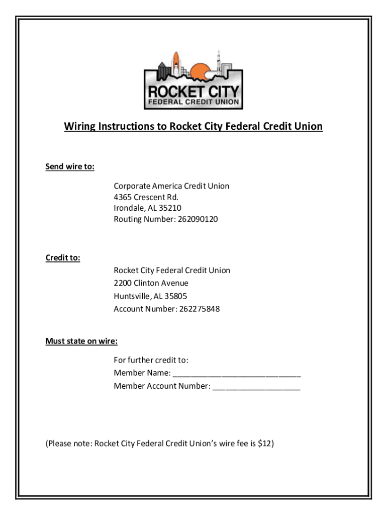 Get the free Wiring Instructions to Rocket City Federal Credit Union