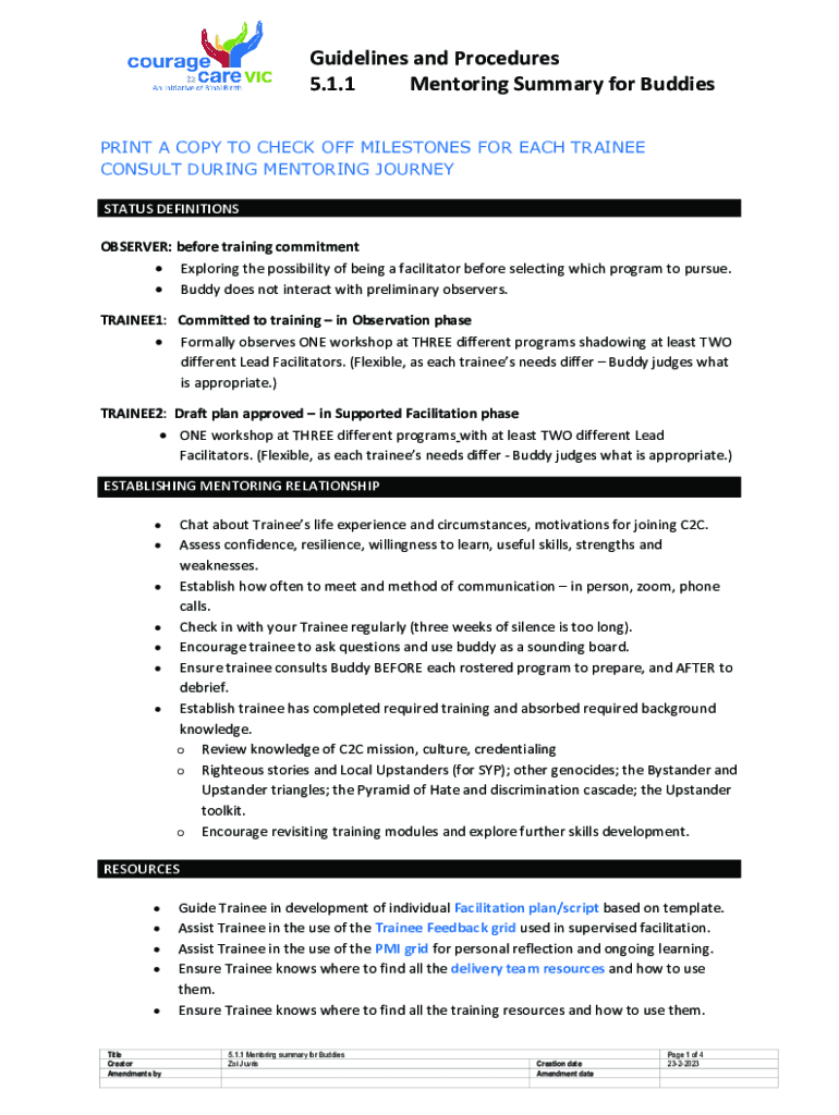 Guidelines and Procedures 5.1.1 Mentoring Summary for Buddies PRINT A COPY TO CHECK OFF MILESTONES FOR EACH TRAINEE CONSULT DURING MENTORING JOURNEY STATUS DEFINITIONS OBSERVER: before training commitment