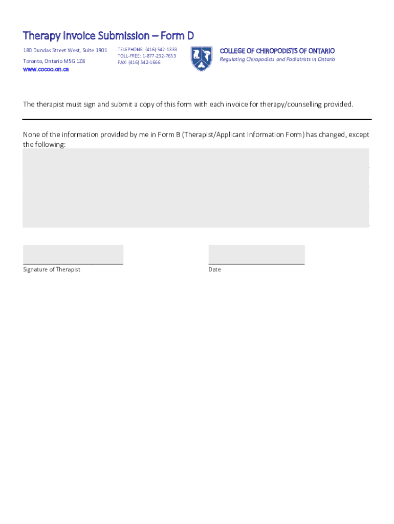 Therapy Invoice Submission Form D 180 Sundas Street West, Suite 1901 Toronto, Ontario M5G 1Z8www.cocoa.on.telephone: (416) 5421333 TOLL-FREE: 18772327653 FAX: (416) 5421666COLLEGE OF CHIROPODISTS