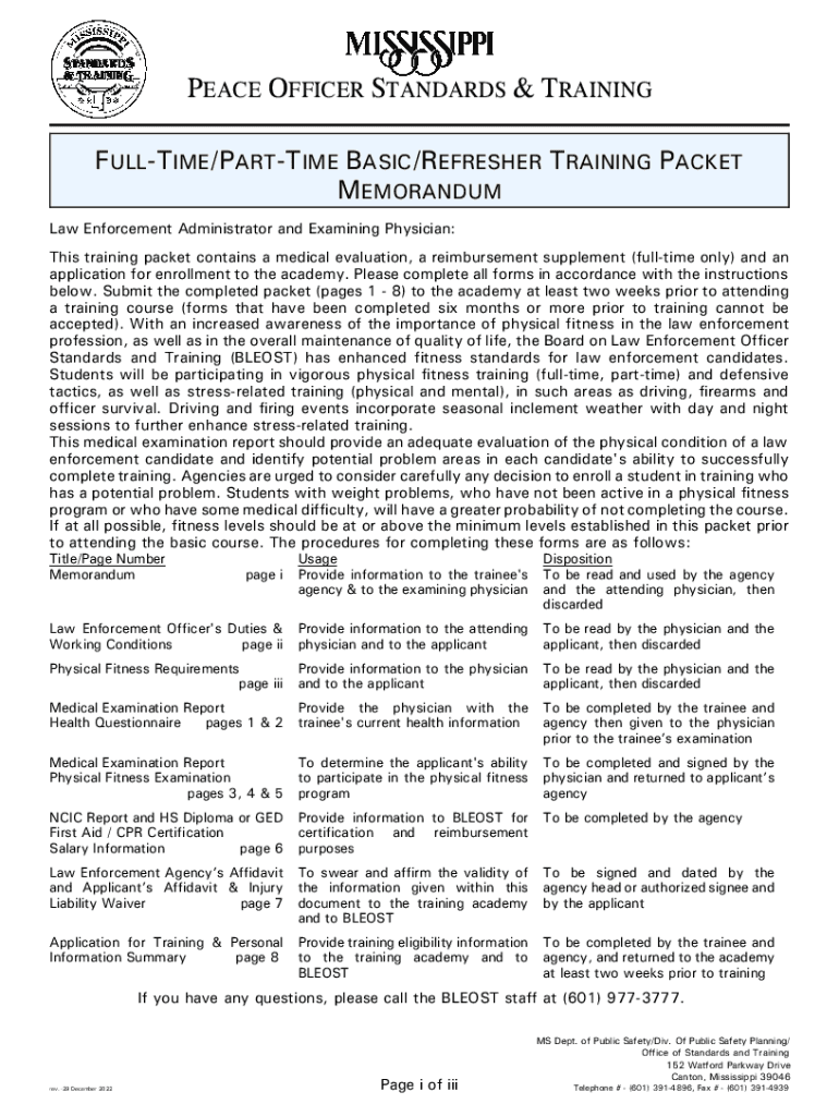 PEACE OFFICER STANDARDS & TRAINING FULL TIME/PART TIME BASIC/REFRESHER TRAINING PACKET MEMORANDUM Law Enforcement Administrator and Examining Physician: This training packet contains a medical evaluation,