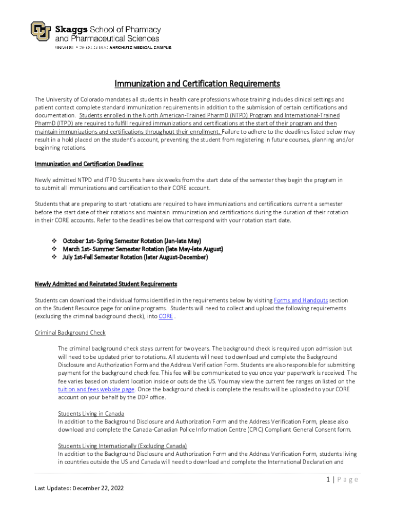 Immunization and Certification Requirements The University of Colorado mandates all students in health care professions whose training includes clinical settings and patient contact complete standard