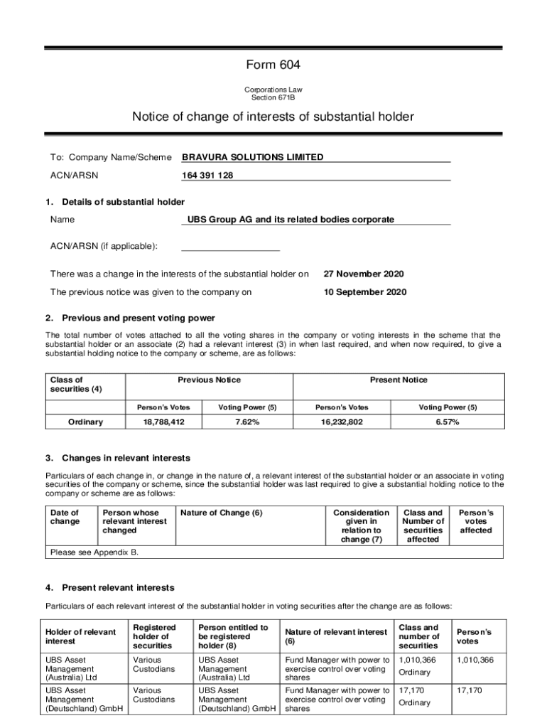 Section 671BNotice of change of interests of substantial holder: Company Name/SchemeBRAVURA SOLUTIONS LIMITED ACN/ARSN164 391 1281. Details of substantial holder