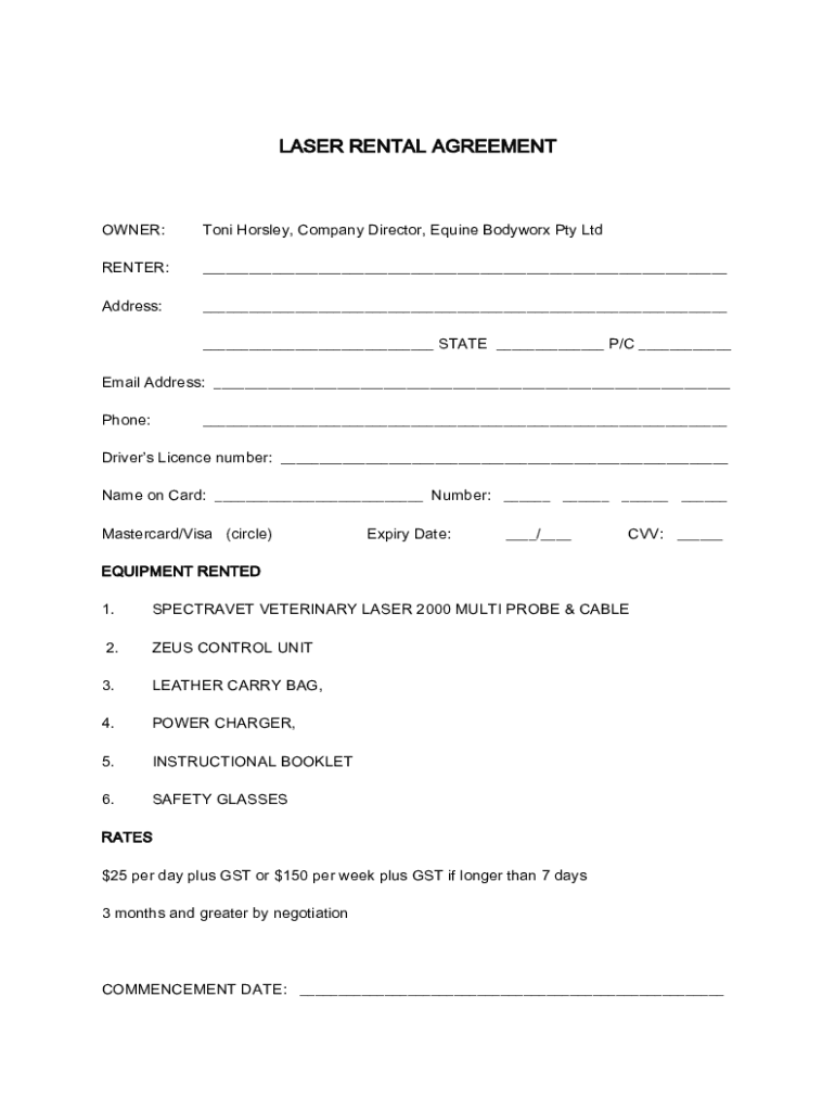 LASER RENTAL AGREEMENTOWNER:Toni Horsey, Company Director, Equine Bodywork Pty Renter:___Address:___ ___ STATE ___ P/C ___Email Address: ___ Phone:___Driver's License number: ___ Name on Card: ___