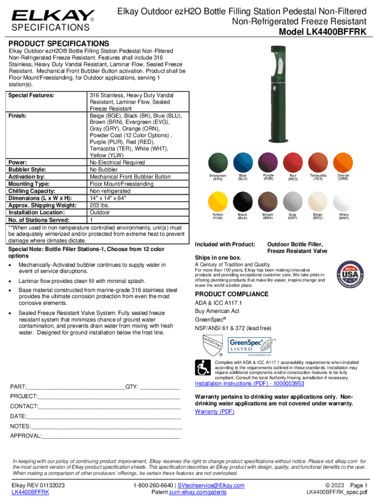 SPECIFICATIONSElkay Outdoor ezH2O Bottle Filling Station Pedestal Unfiltered Unrefrigerated Freeze Resistant Model LK4400BFFRKPRODUCT SPECIFICATIONS Elway Outdoor ezH2O Bottle Filling Station Pedestal