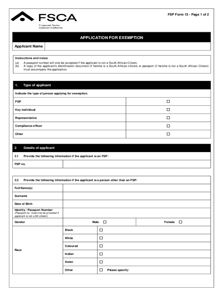 FSP Form 13-Page 1 of 2APPLICATION FOR EXEMPTION Applicant NameInstructions and notes: (a) (b)A passport number will only be accepted if the applicant is not a South African Citizen. A copy of the
