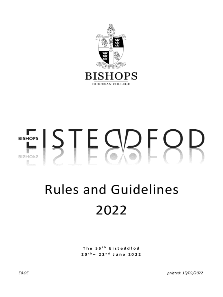 Rules and Guidelines 2022 The 35th Eisteddfod 20th 22nd June 2022E&OEprinted: 15/03/2022RULE No. 1 No pupils may enter a work in the eisteddfod which they have entered a previous Bishops Eisteddfod