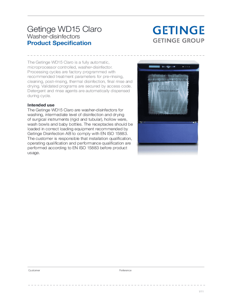 Ge tinge WD15 Clark Washerdisinfectors Product Specification Ge tinge WD15 Clark is a fully automatic, microprocessor controlled, washerdisinfector. Processing cycles are factory programmed with recommended