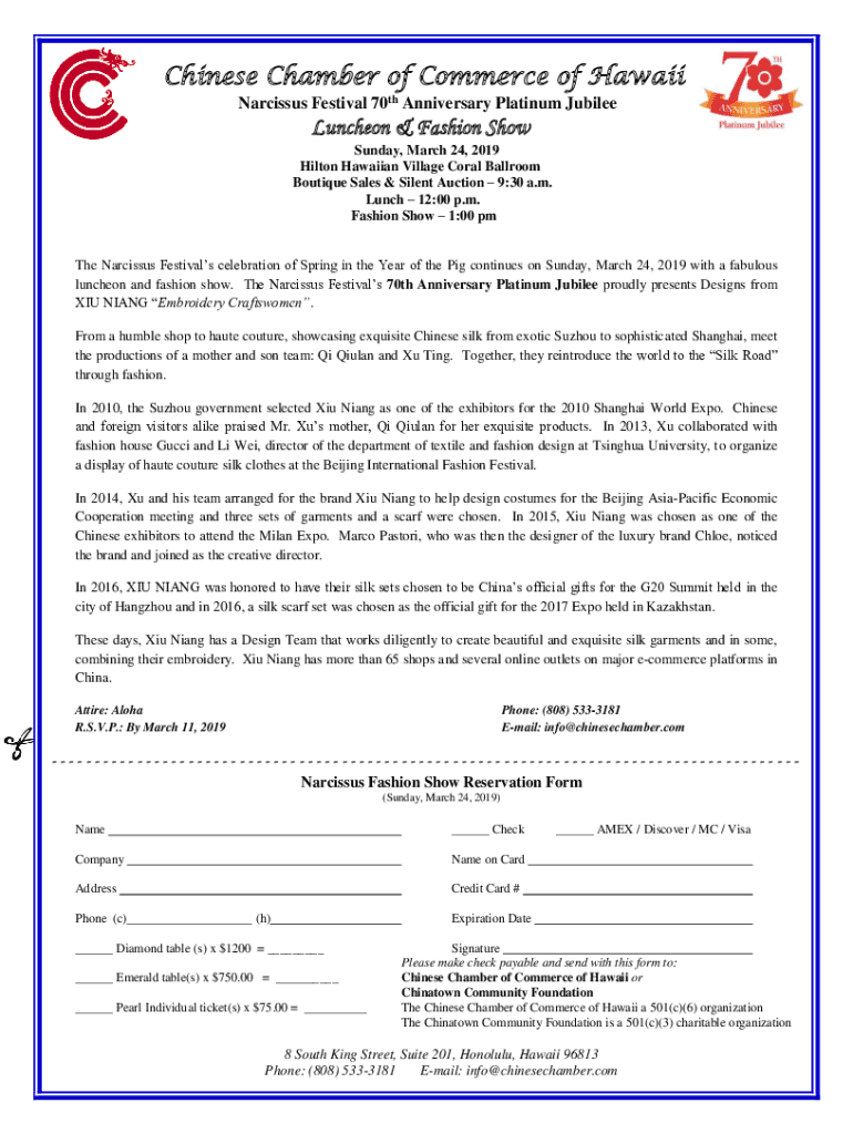 Chinese Chamber of Commerce of Hawaii Narcissus Festival 70th Anniversary Platinum JubileeLuncheon & Fashion Show Sunday, March 24, 2019, Hilton Hawaiian Village Coral Ballroom Boutique Sales & Silent