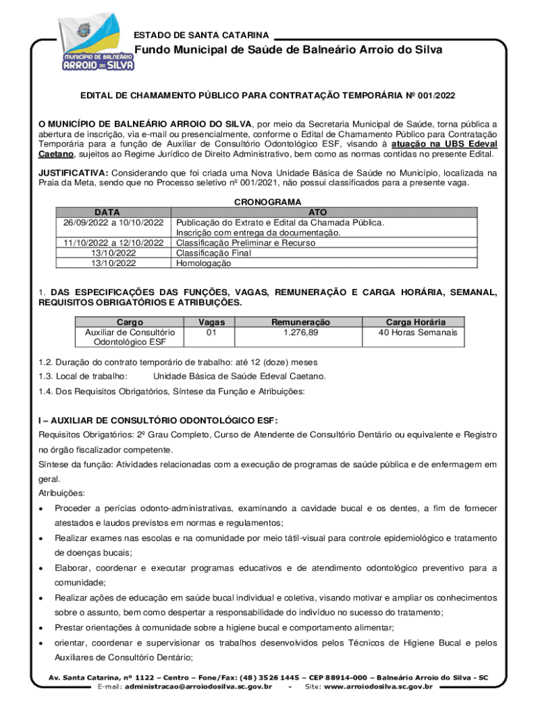ESTATE DE SANTA CATARINAFundo Municipal de Sade de Balnerio Arroyo do SilvaEDITAL DE CHALAMET PBL ICO PARA CONTRA TAO EMPORIA N 001/2022O MUNICIPAL DE ALBERIO ARROYO DO SILVA, POR Mao the Secretariat