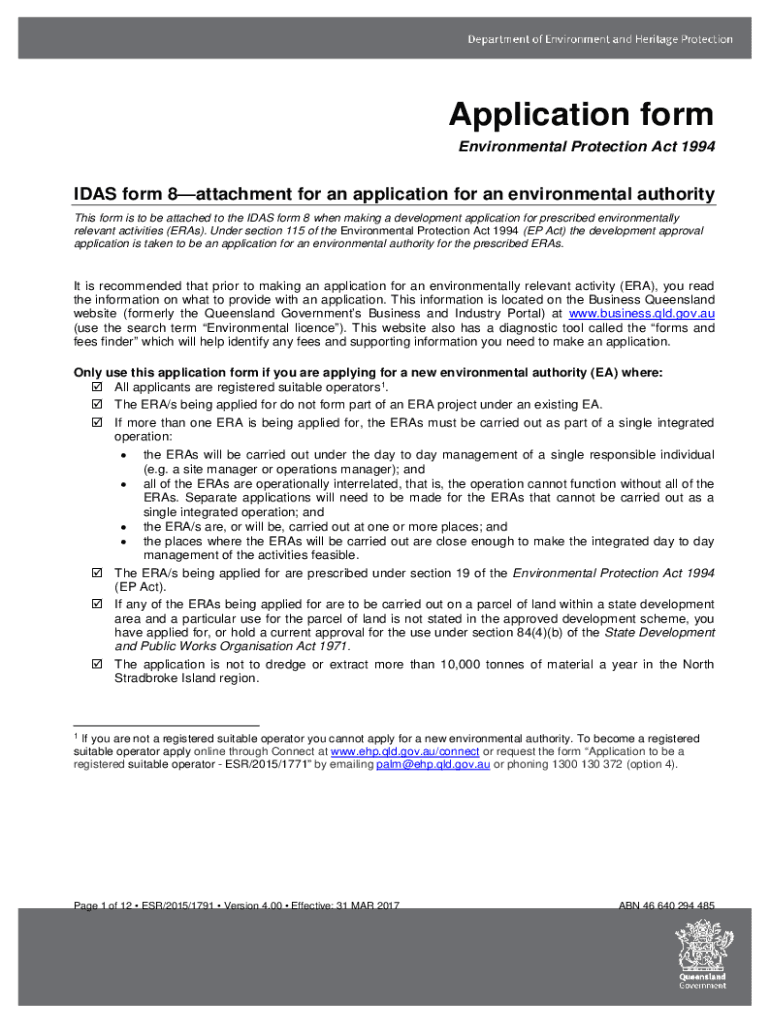 Application form Environmental Protection Act 1994IDAS form 8attachment for an application for an environmental authority This form is to be attached to the IDEAS form 8 when making a development