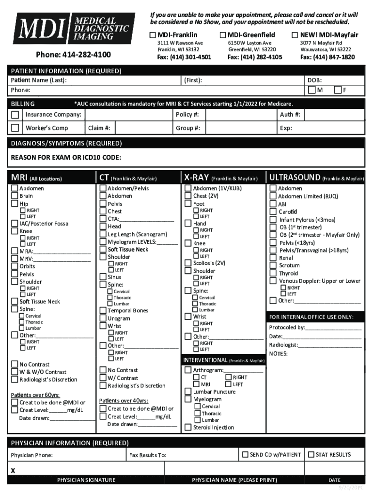 If you are unable to make your appointment, please call and cancel, or it will be considered a No Show, and your appointment will not be rescheduled.MDIFranklinMDIGreeneldNEW! MDIMayfairFax: (414)