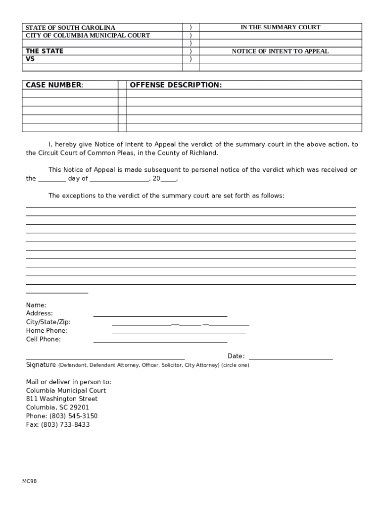 How to fill out Notice of Intent to Appeal - Columbia Municipal Court