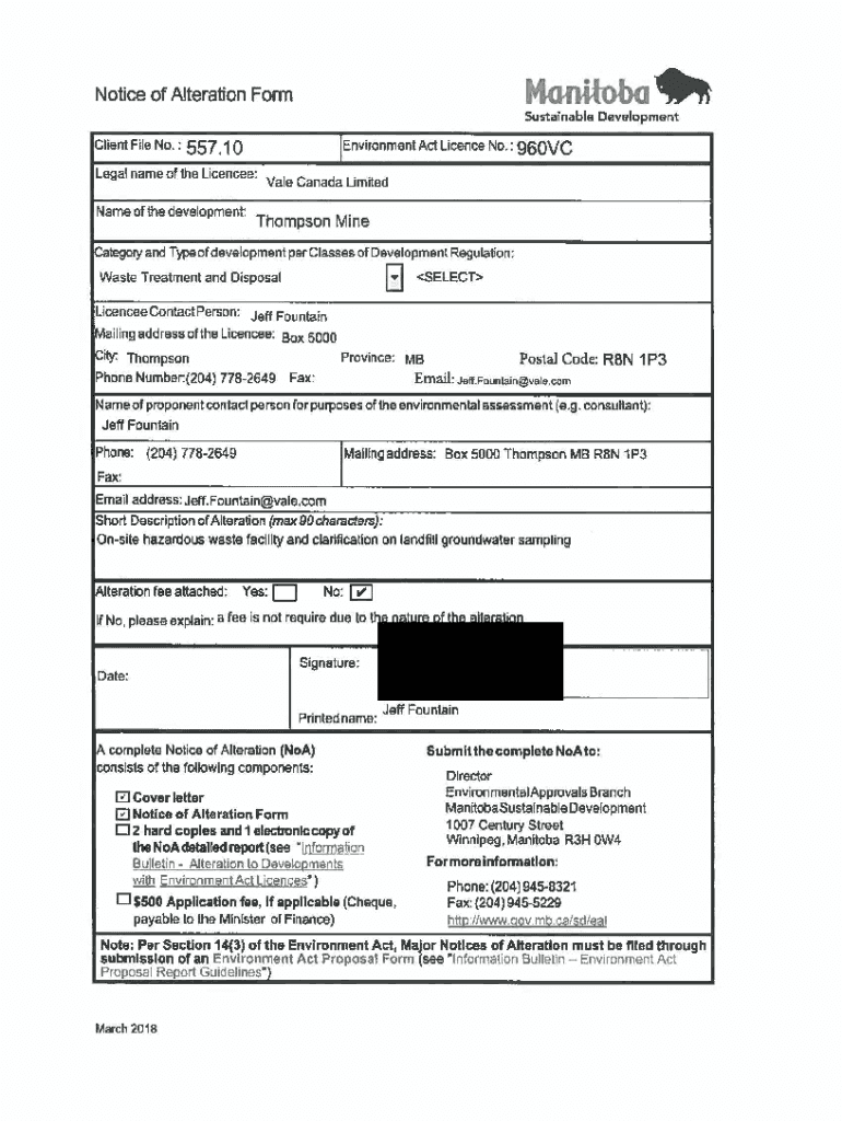Client File No. 557.1 Environment Act License No. 960VCLegal name of the Licensee: Vale Canada Limited
