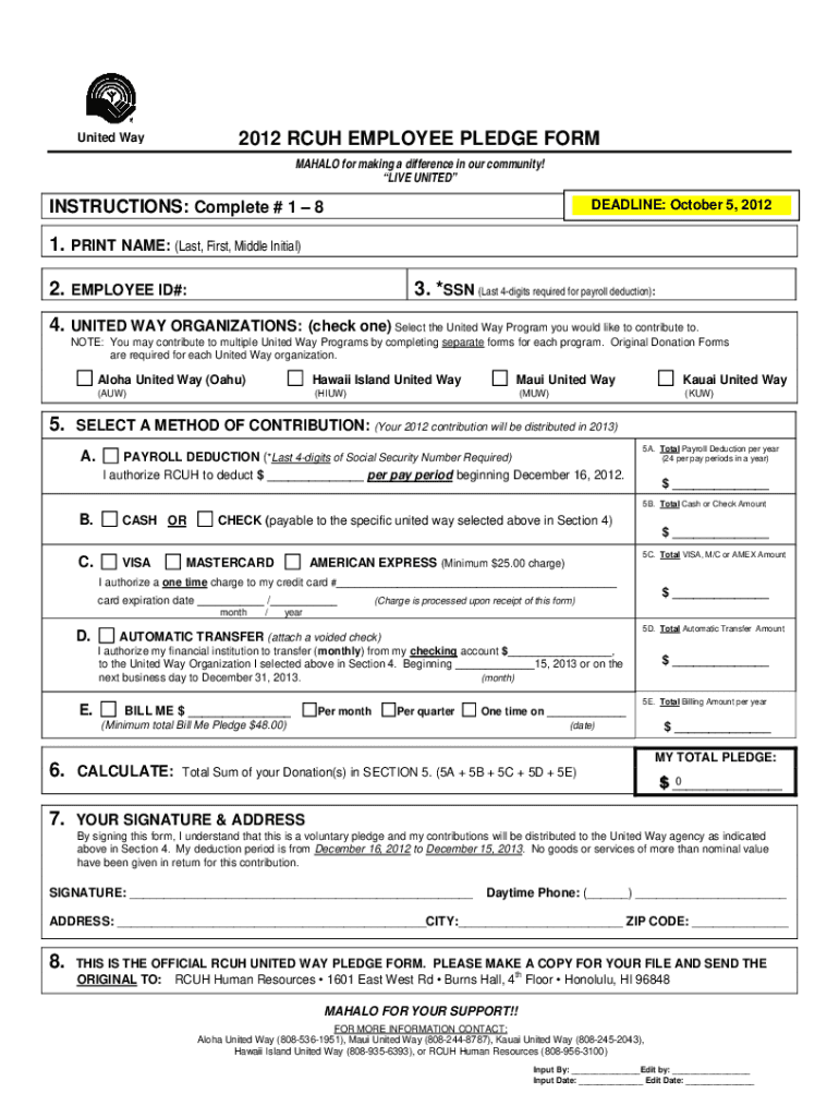 Get the free 2012 RCUH EMPLOYEE PLEDGE FORM
