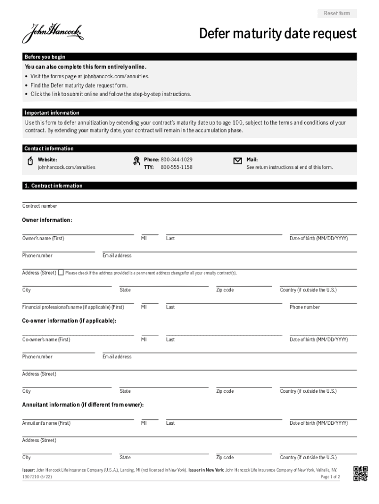 Reset former maturity date request Before you begins can also complete this form entirely online. Visit the forms page at johnhancock.com/annuities. Find the Defer maturity date request form. Click