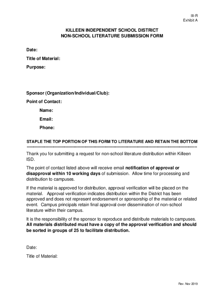 IGIR Exhibit KILLEEN INDEPENDENT SCHOOL DISTRICT SCHOOL LITERATURE SUBMISSION FORM Date: Title of Material: Purpose:Sponsor (Organization/Individual/Club): Point of Contact: Name: Email: Phone: STAPLE