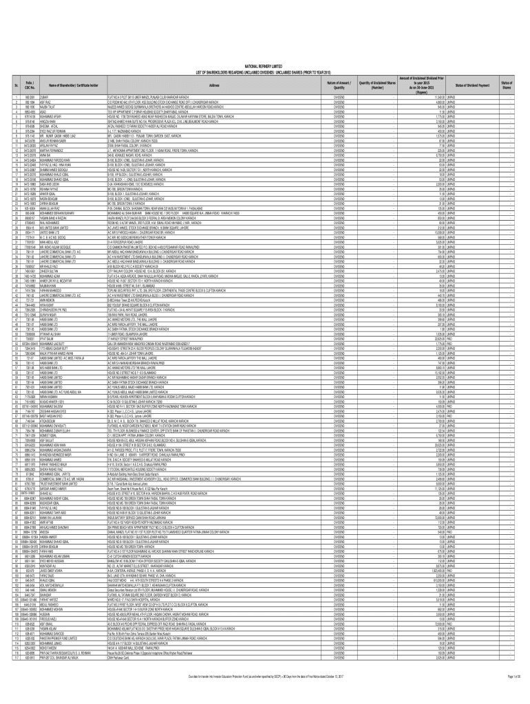NATIONAL REFINERY LIMITED LIST OF SHAREHOLDERS REGARDING UNCLAIMED DIVIDENDS / UNCLAIMED SHARES (PRIOR TO YEAR 2015) Sr. 1 2 3 4 5 6 7 8 9 10 11 12 13 14 15 16 17 18 19 20 21 22 23 24 25 26 27 28