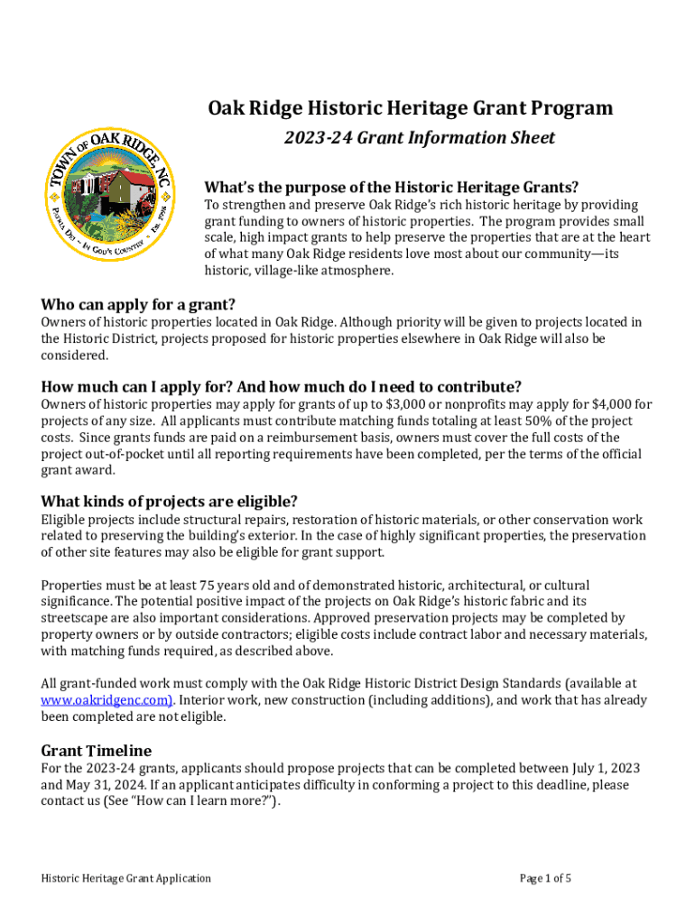 Oak Ridge Historic Heritage Grant Program 202324 Grant Information Sheet What's the purpose of the Historic Heritage Grants? To strengthen and preserve Oak Ridges rich historic heritage by providing