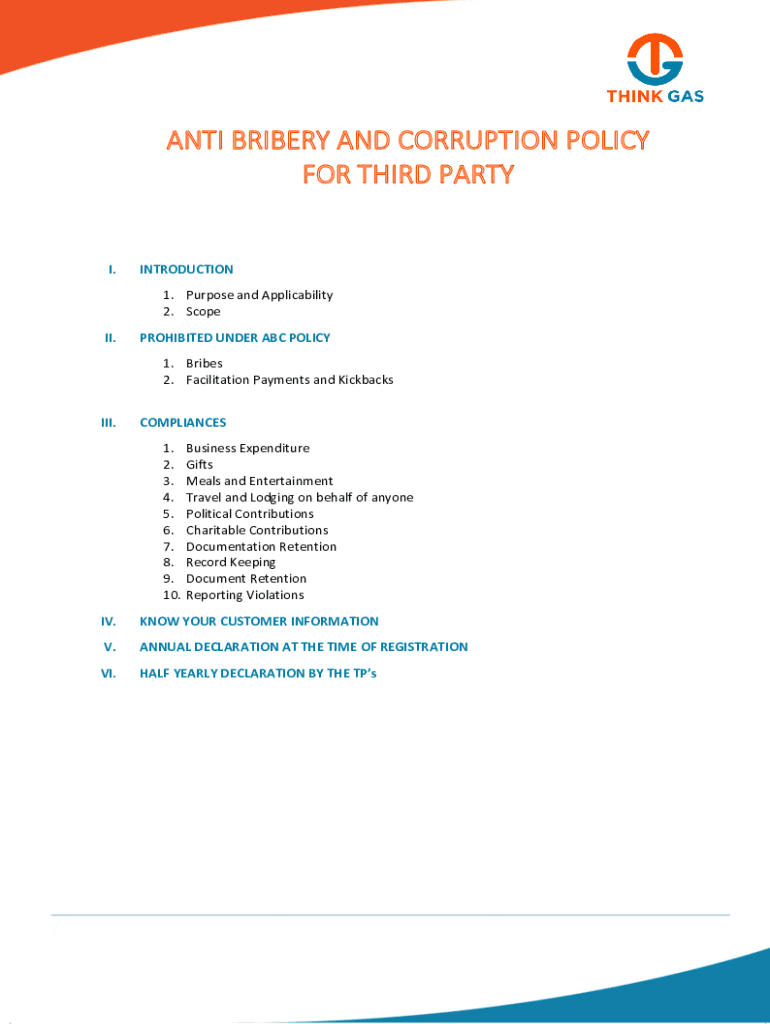 ANTI BRIBERY AND CORRUPTION POLICY FOR THIRD PARTY.INTRODUCTION 1. Purpose and Applicability 2. Scope.PROHIBITED UNDER ABC POLICY 1. Bribes 2. Facilitation Payments and Kickbacks. COMPLIANCE 1. 2.