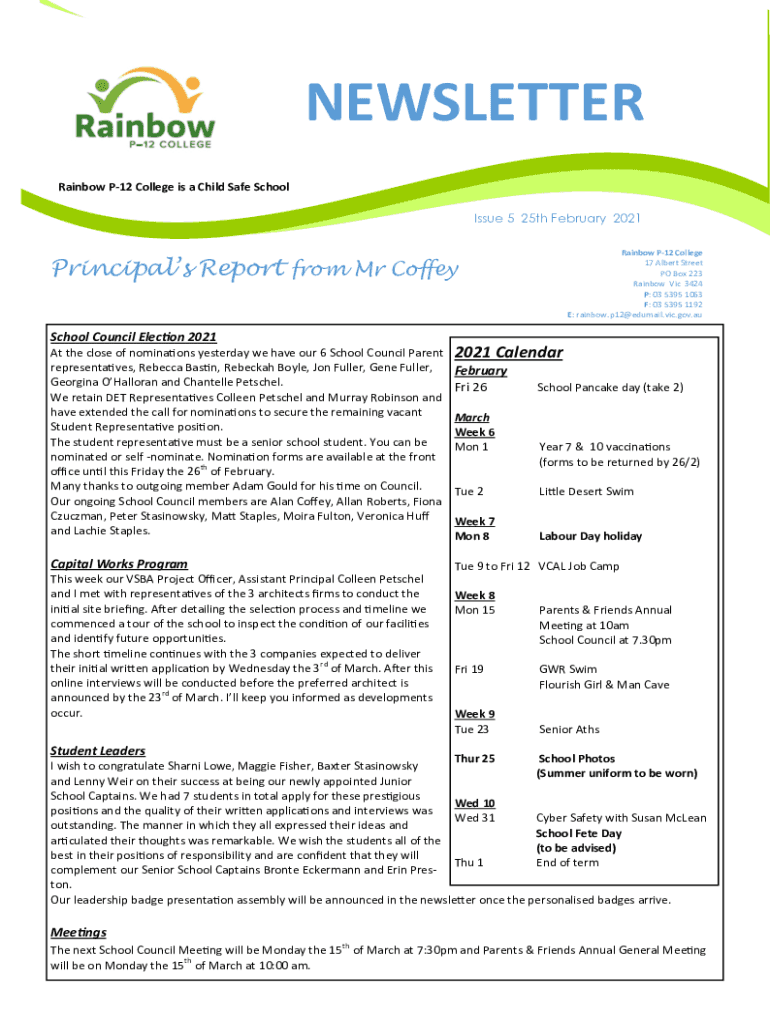 NEWSLETTER Rainbow P12 College is a Child Safe School Issue 5 25th February 2021 Rainbow P12 College 17 Albert Street PO Box 223 Rainbow Vic 3424 P: 03 5395 1063 F: 03 5395 1192 E: rainbow.p12@edumail.vic.gov.auPrincipals