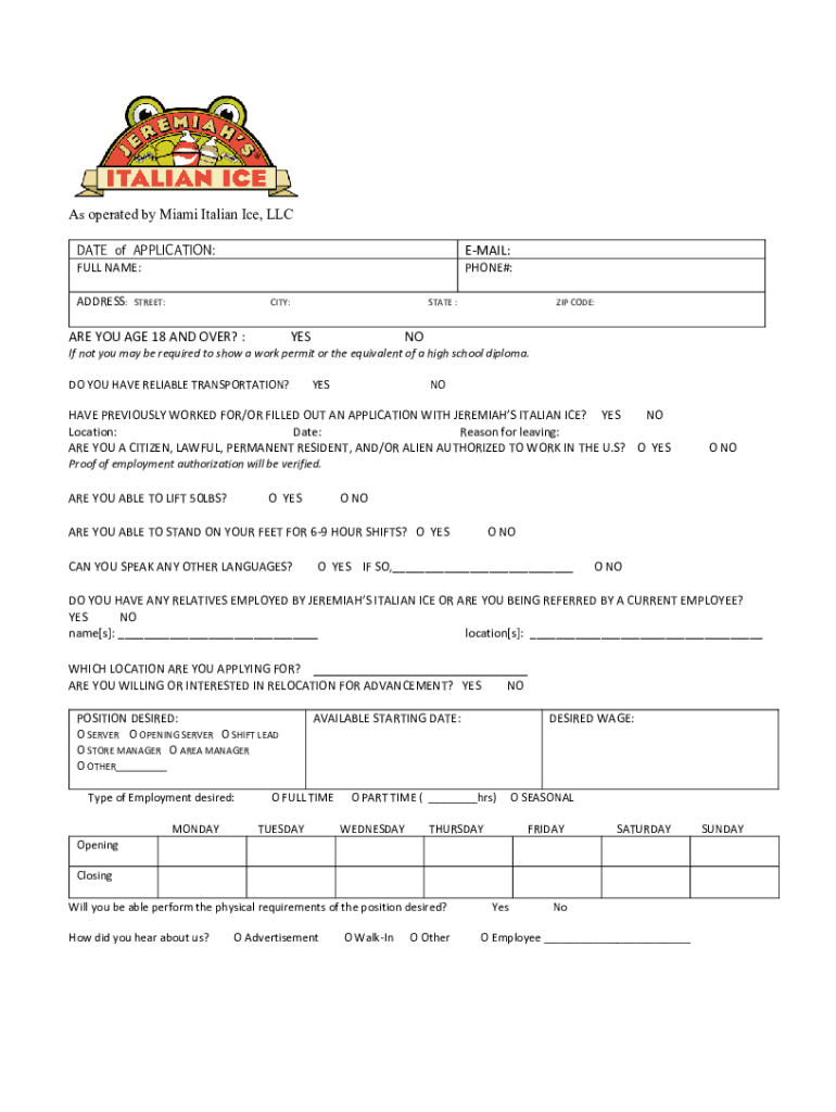 As operated by Miami Italian Ice, LLC EMAIL:DATE of APPLICATION: FULL NAME: ADDRESS:PHONE#:STREET:CITY:ARE YOU AGE 18 AND OVER? STATE :YES ZIP CODE:Coif not you may be required to show a work permit