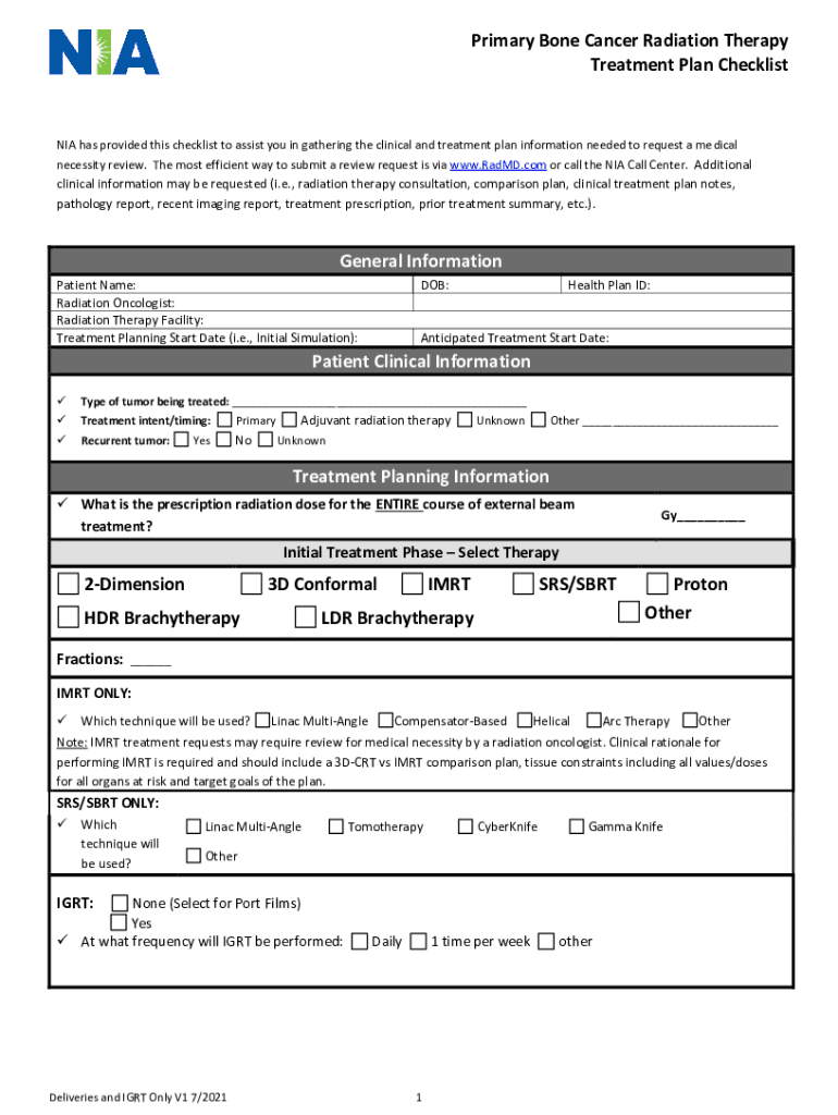 Primary Bone Cancer Radiation Therapy Treatment Plan Checklist NIA has provided this checklist to assist you in gathering the clinical and treatment plan information needed to request a medical necessity