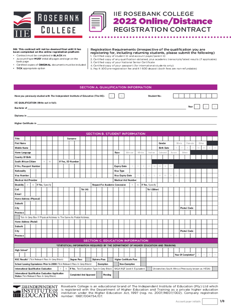 DIE ROSEANN COLLEGE2022 Online/Distance REGISTRATION CONTRACT Registration Requirements (irrespective of the qualification you are registering for, including returning students, please submit the