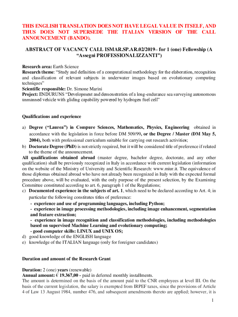 THIS ENGLISH TRANSLATION DOES NOT HAVE LEGAL VALUE IN ITSELF, AND THUS DOES NOT SUPERSEDE THE ITALIAN VERSION OF THE CALL ANNOUNCEMENT (BAND). ABSTRACT OF VACANCY CALL ISMRA.SP.AR.02/2019 for 1 (one)