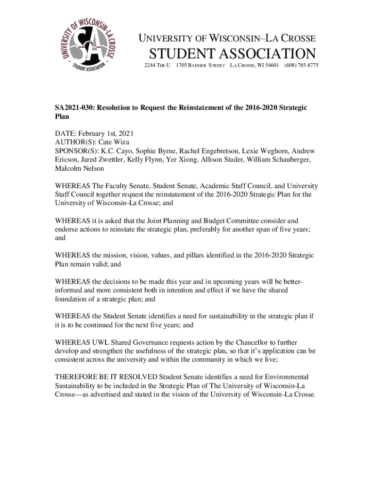 UNIVERSITY OF WISCONSIN CROSSESTUDENT ASSOCIATION 2244 THE U 1705 BADGER STREET LA CROSSE, WI 54601 (608) 7858775SA2021030: Resolution to Request the Reinstatement of the 20162020 Strategic Plan DATE: