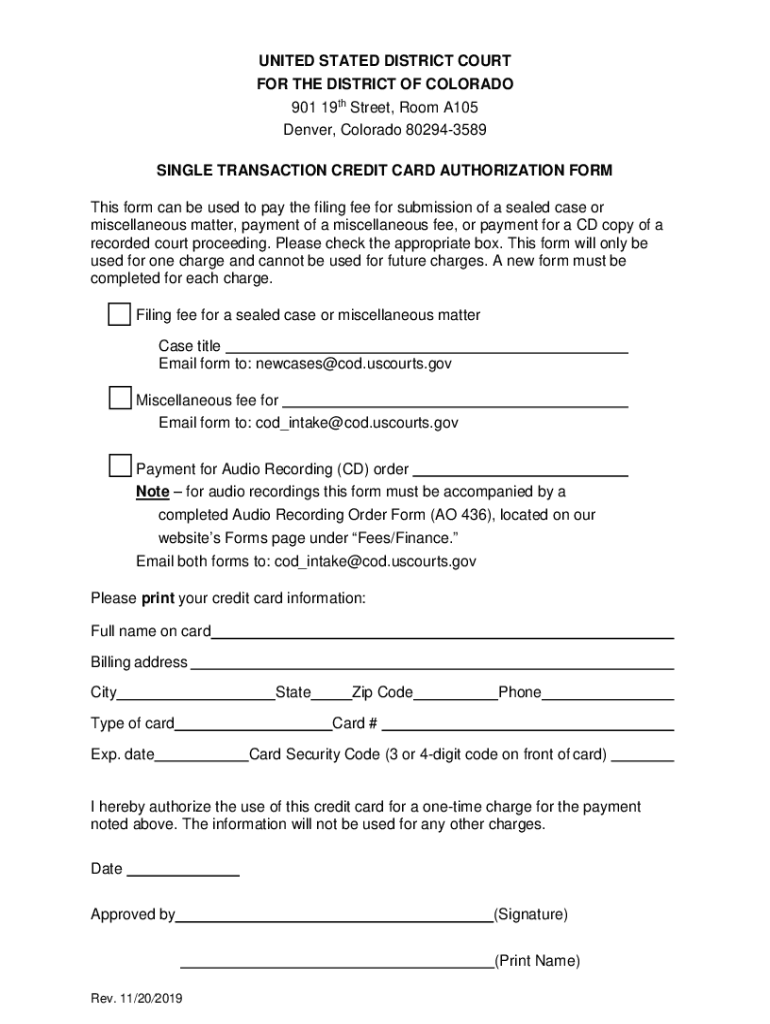 UNITED STATED DISTRICT COURT FOR THE DISTRICT OF COLORADO 901 19th Street, Room A105 Denver, Colorado 802943589 SINGLE TRANSACTION CREDIT CARD AUTHORIZATION From This form can be used to pay the filing