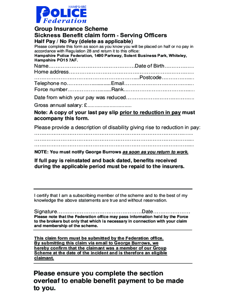 Group Insurance Scheme Sickness Benefit claim form Serving Officers Half Pay / No Pay (delete as applicable)Please complete this form as soon as you know you will be placed on half or no pay in accordance