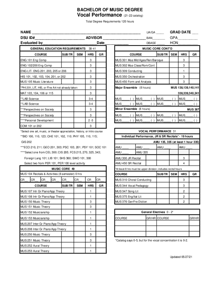 BACHELOR OF MUSIC DEGREEVocal Performance(2122 catalog)Total Degree Requirements 120 surname ___UA/GA ___DSU ID#___ ADVISOR ___BAN___