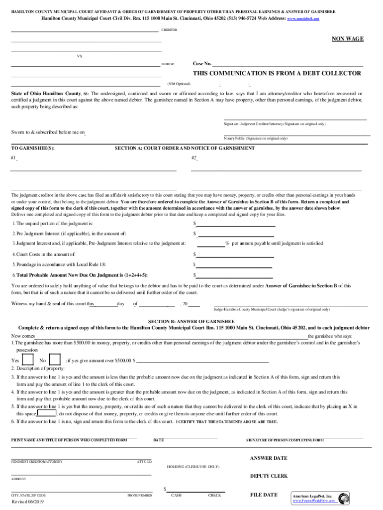 HAMILTON COUNTY MUNICIPAL COURT AFFIDAVIT & ORDER OF GARNISHMENT OF PROPERTY OTHER THAN PERSONAL EARNINGS & ANSWER OF GARNISHEE Hamilton County Municipal Court Civil Div. Rm. 115 1000 Main St. Cincinnati,