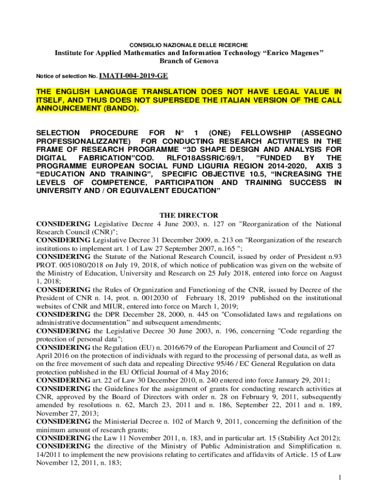 CONSIGNED NATIONAL DELL RICERCHEInstitute for Applied Mathematics and Information Technology Enrico Magenes Branch of Geneva Notice of selection No. IMATI0042019GETHE ENGLISH LANGUAGE TRANSLATION