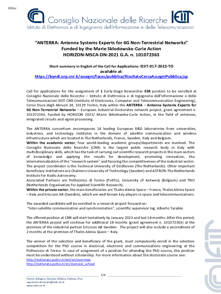 OSCarANTERRA: Antenna Systems Experts for 6G Terrestrial Networks Funded by the Marie SkodowskaCurie Action HORIZONMSCADN2021 G.A. n. 101072363 Short summary in English of the Call for Applications: