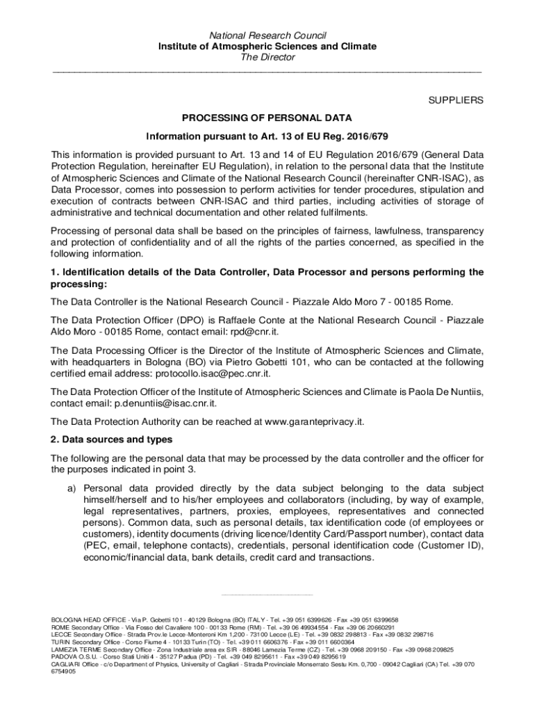 National Research Council Institute of Atmospheric Sciences and Climate The Director ___SUPPLIERS PROCESSING OF PERSONAL DATA Information pursuant to Art. 13 of EU Reg. 2016/679 This information is
