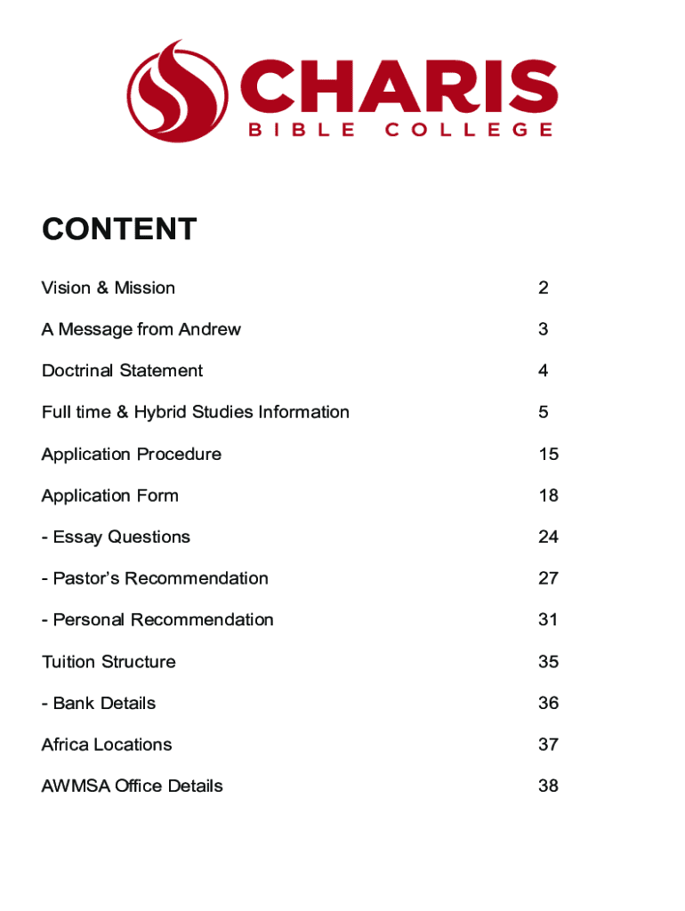 CONTENT Vision & Mission2 A Message from Andrew3 Doctrinal Statement4 Full time & Hybrid Studies Information5Application Procedure15 Application Form18 Essay Questions24 Pastors Recommendation27 Personal