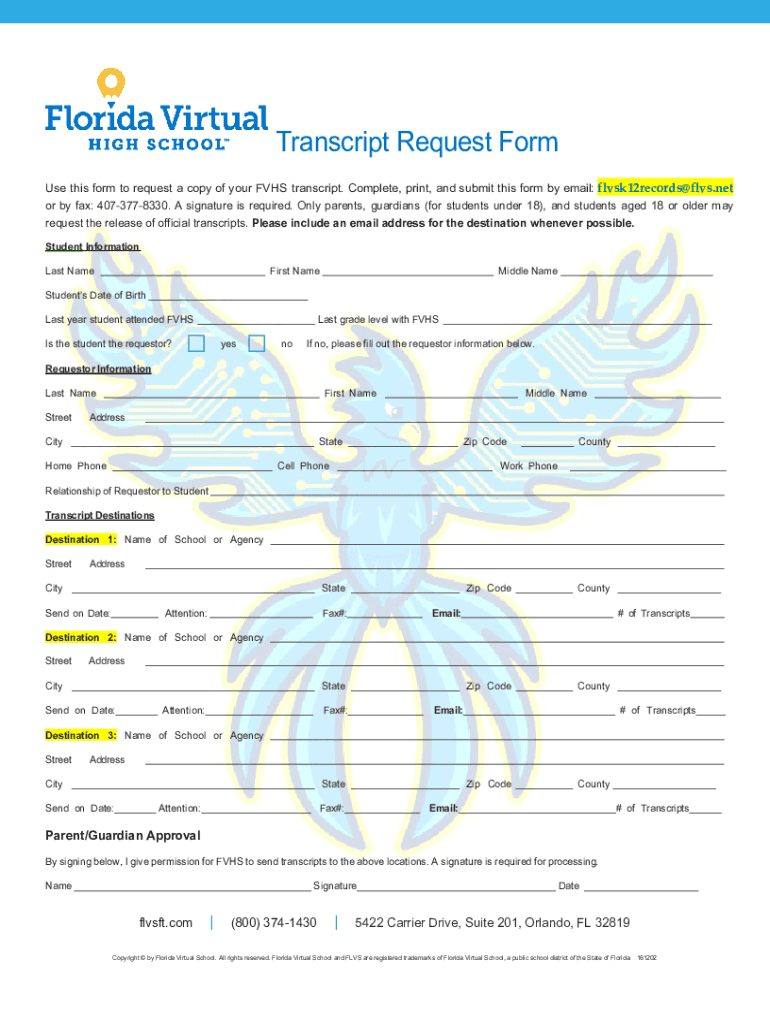 Transcript Request Form Use this form to request a copy of your VHS transcript. Complete, print, and submit this form by email: flvsk12records@flvs.net or by fax: 4073778330. A signature is required.