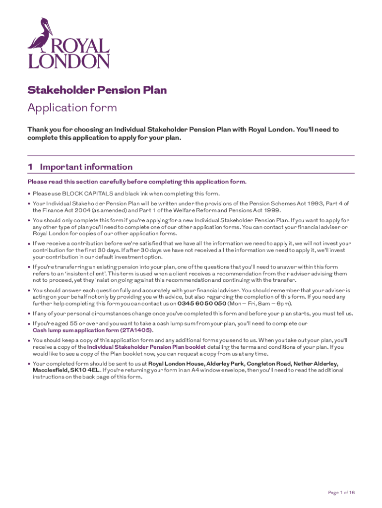 Stakeholder Pension PlanApplication form Thank you for choosing an Individual Stakeholder Pension Plan with Royal London. You'll need to complete this application to apply for your plan.1Important