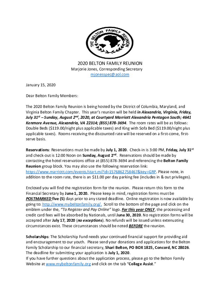 2020 BELTON FAMILY REUNION Marjorie Jones, Corresponding Secretary mjonesspec@aol.com January 15, 2020, Dear Belton Family Members: The 2020 Belton Family Reunion is being hosted by the District of