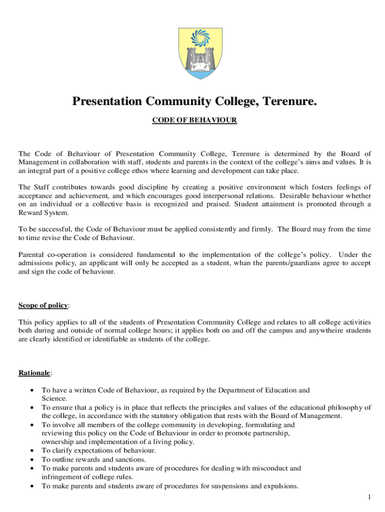 Presentation Community College, Tenure. CODE OF BEHAVIOURThe Code of Behavior of Presentation Community College, Tenure is determined by the Board of Management in collaboration with staff, students