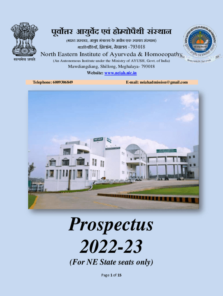 (,) , 793018North Eastern Institute of Ayurveda & Homeopathy (An Autonomous Institute under the Ministry of AYUSH, Govt. of India)Mawdiangdiang, Shillong, Meghalaya 793018 Website: WWW