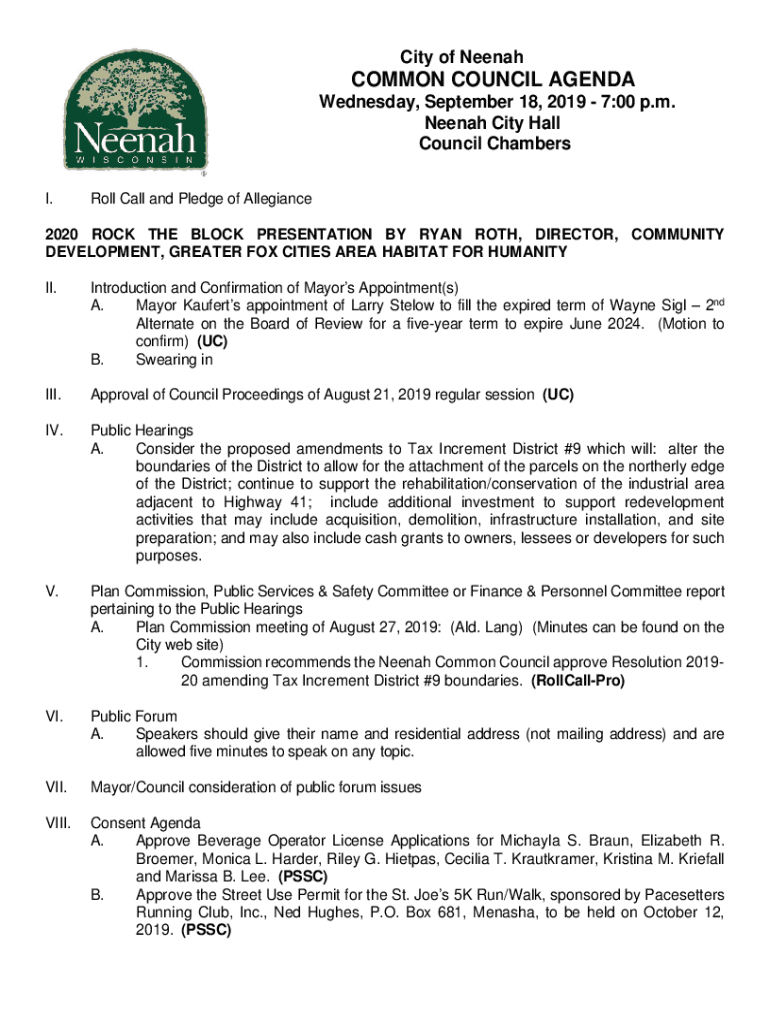 City of NeenahCOMMON COUNCIL AGENDA Wednesday, September 18, 2019 7:00 p.m. Née nah City Hall Council Chambers I. Roll Call and Pledge of Allegiance2020 ROCK THE BLOCK PRESENTATION BY RYAN ROTH,